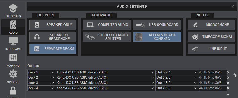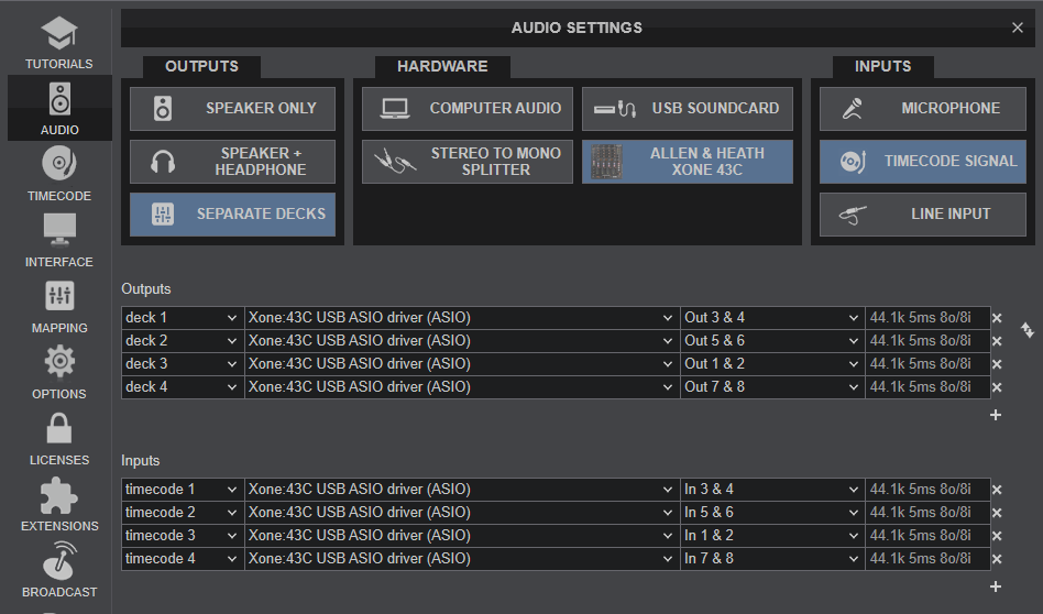 The Xone 43C offers 4 stereo input for the USB Audio interface which can be used to connect up to 4 Timecode (Vinyl or CD) devices.