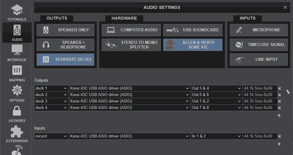 - Manually add a record line to VirtualDJ Audio Setup, pointing to the relative USB Channel of the Xone 43C Input