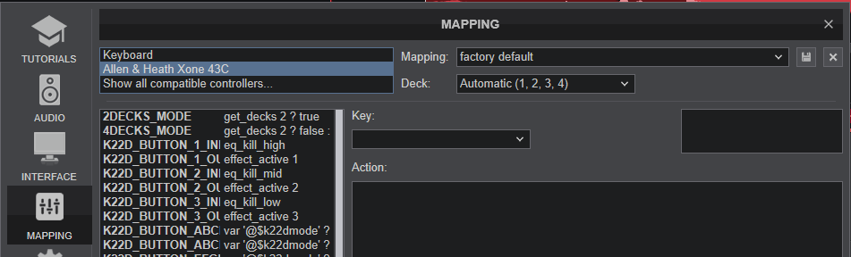 The Xone 43C should be visible in the MAPPING tab of VirtualDJ Settings and the “factory default” available/selected from the Mappings drop-down list.