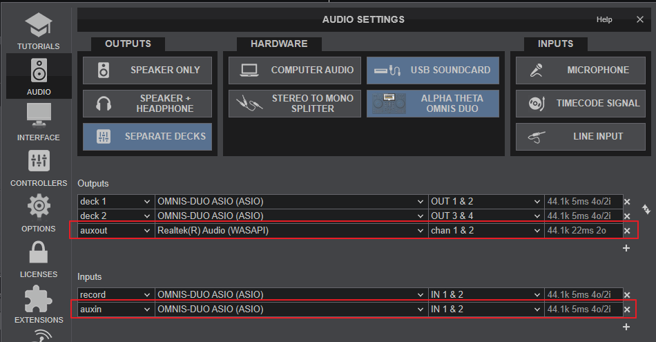 The Omnis Duo is a hardware mixer (applies its own Equalizer, Color FX, Effects, volumes etc), so your speakers need to be connected to the rear Master output sockets.