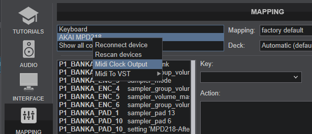 In External MIDI-Clock (LED of PAD Nr.15 is On) , the triggered actions are repeated based on the Tempo sent by VirtualDJ (comes from the Master Deck). In order VirtualDJ to send MIDI-Clock to the device, it needs to be enabled from the Controllers tab of Settings by right-clicking on the MPD218.