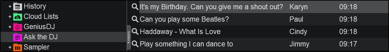 Ask the DJ folder in the folder menu of VirtualDJ. The message, name of the person (if submitted), and the time of the message will appear in the folder.
