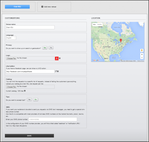 This will open the Setup page in your default browser. Here you can create unique Venue names (or your DJ name), and customize options for each one.