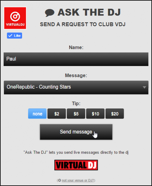 They can then fill out their name (optional) and the message field to send you messages, requests, dedications, etc. as well as the ability to instantly like your Facebook page or send you a Tip. If your Catalog has been uploaded, the audience will only be able to search for what is in your library (no personal messages).