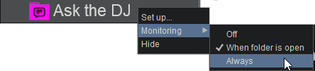 You can also decide how the Ask the DJ folder is monitored by right clicking and choosing Monitoring. Three options are available to choose from: