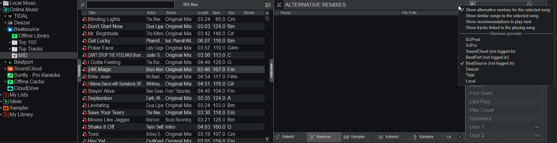 I can't see any alternative remixes from Beatsource, even when logged in to a Premium Beatsource account. In the options of the right panel it says "Beatsource (not logged in)", but I am logged in and can see my playlists and play songs just fine. In the left panel it doesn't say (not logged in).