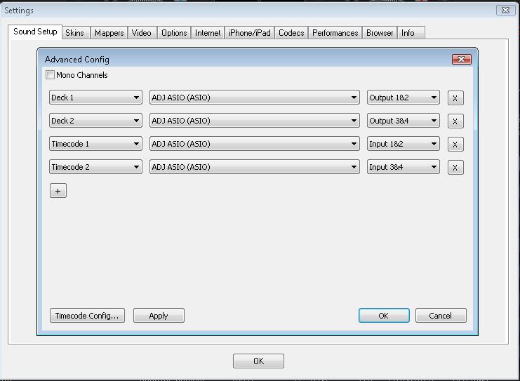 In case you want VVMS4 to control just 2 decks in VirtualDJ (with a 2 deck skin) and leave the other 2 in analogue set your Audio Config as..
