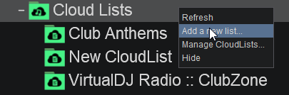 Some public automatic CloudLists are synced to famous charts, like iTunes or Deezer charts, while other are maintained by active communities of VirtualDJ users for each sub-genre.