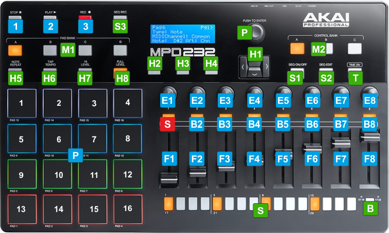 S SHIFTHold this button down to access secondary actions as described in the SHIFT ACTION column. M2 *CONTROL BANKSelect one of the 3 available modes for the 8 CTRL knobs, the 8 Faders and the 8 buttons.