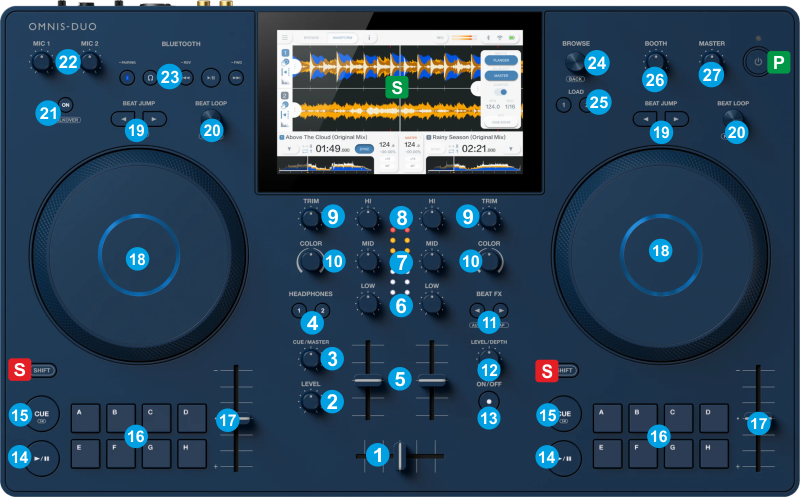 - BLUETOOTH : An external device can be paired via Bluetooth and the audio can be routed to a Deck (or Master). Read further details in the Alpha theta Omnis Duo manual.
