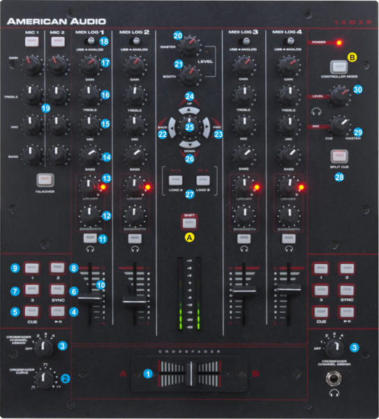 - CROSSFADER. Blends audio between the channels assigned to the left and right side of the crossfader.