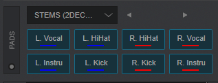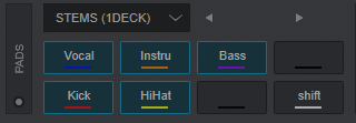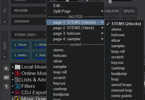 By default Pads 1 and 2 will load the special STEMS (2 Decks) and STEMS (1 Deck) Pad pages (available only when the LPD8 is connected), and Pads 3 and 4 will load Hotcues and Sampler Pages.