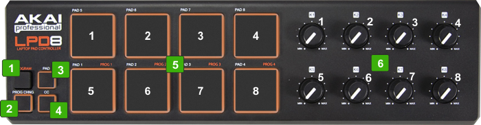 1 PROGRAMUse this button to enter the Program Selection mode. When selected (buttons 2 to 4 are off), use the Pads [5] 5 to 8 to select one of the 4 available Programs. The default mapping is based on Program 1, so make sure Pad 5 is turned on.2 PROG.CHNGUse this button to enter the Page/mode selection (led will be lit). Then use Pads 1 to 8 to select one of the pre-defined Pads Pages of VirtualDJ. You can change the default Pages by selecting a different pre-selected Page. See Pad Page Assignment in VirtualDJ Manual3 PADUse this button to select the Pads mode. In this mode Pads 1 to 8 trigger the Pad buttons of the selected Pads page4 CCUse this button to select the CC mode. In this mode Pads 1 to 8 become velocity Pads, and offer the same action as the 8 Knobs [6]5 PADS 1-8If the device is in PAD mode, use these buttons to trigger the assigned action of Pad 1 to 8 of the selected Pads Page in VirtualDJ6 KNOBS 1-8Regardless the mode the device is (PAD, CC, PRG), use these knobs to trigger the related action of Pad 1 to 8 of the selected Pads Page in VirtualDJ.