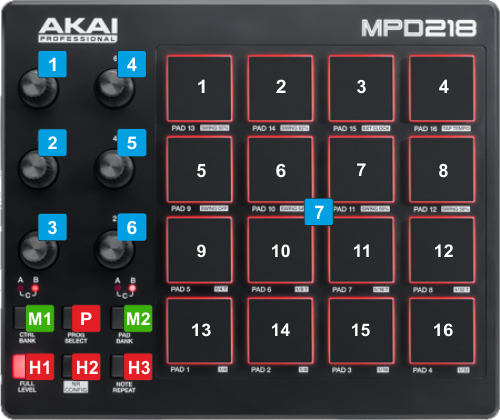 Pad 5/13 : Controls the 1st FX button (if available) of the selected Effect for the Left/Right Deck.