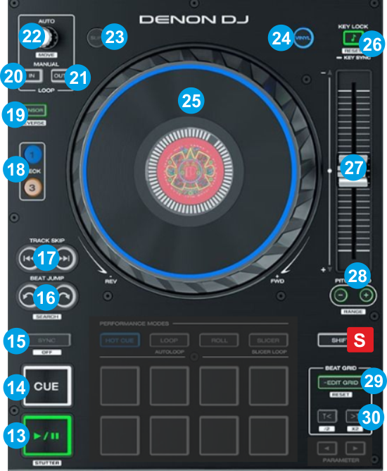 VINYL. Press this button to set the Jogwheel to Vinyl (Scratch) or CD (Bend) mode. In Vinyl mode, use the outer part of the Jogwheel to bend (temporary speed up – slow down the tempo of the track).