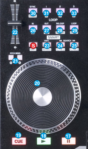The jogwheel is also an aid to adjust the Loop In and Loop Out points or move the Loop through the track. See Loop buttons. - PITCHBEND-/+. Press and keep this button down to temporary slow-down/speed-up the tempo of the track. When the button is released, the track will return to the tempo defined by the pitch slider. Hold SHIFT down and then use the same button to slow-down/speed-up the track more intensively