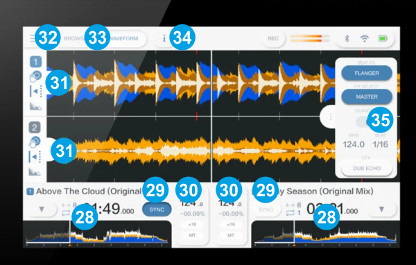 BROWSE: Tap this button to get the Browse view. To return to the Waveform view without loading a Track, you need to tap on the MAIN VIEW (32) and then select the Waveform button.