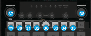 Push the encoder to open/close the GUI of the selected/last triggered effect. - RATIO (same encoder as 28). If the Sampler mode is not selected, use this encoder to adjust the 2nd parameter of the selected/last triggered Effect. Hold TAP(S) down and then use this encoder to adjust the 4th parameter of the same effect.