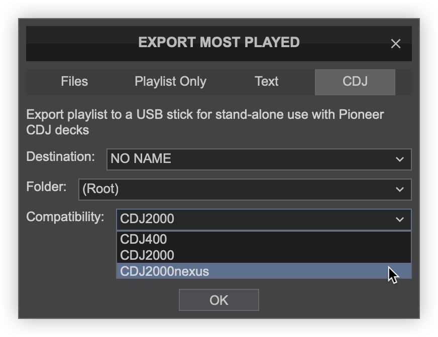 The CDJ tab provides the ability to export files and lists to a CDJ formatted flash drive for stand-alone use with Pioneer CDJ decks. Choose the destination (flash drive), folder on the drive (if any), and then select the compatibility of the CDJ being used.