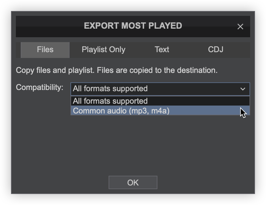 The Files tab provides the ability to copy files and playlists to a new destination on your computer or to an external drive. Select which compatibility is preferred: All formats supported, or common audio (mp3, m4a).