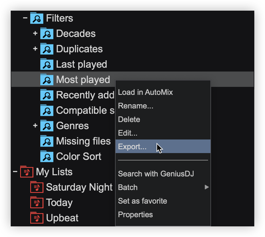 Right click on the filter folder or list and select Export... to open the Export Menu options.