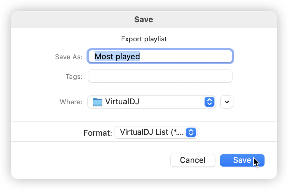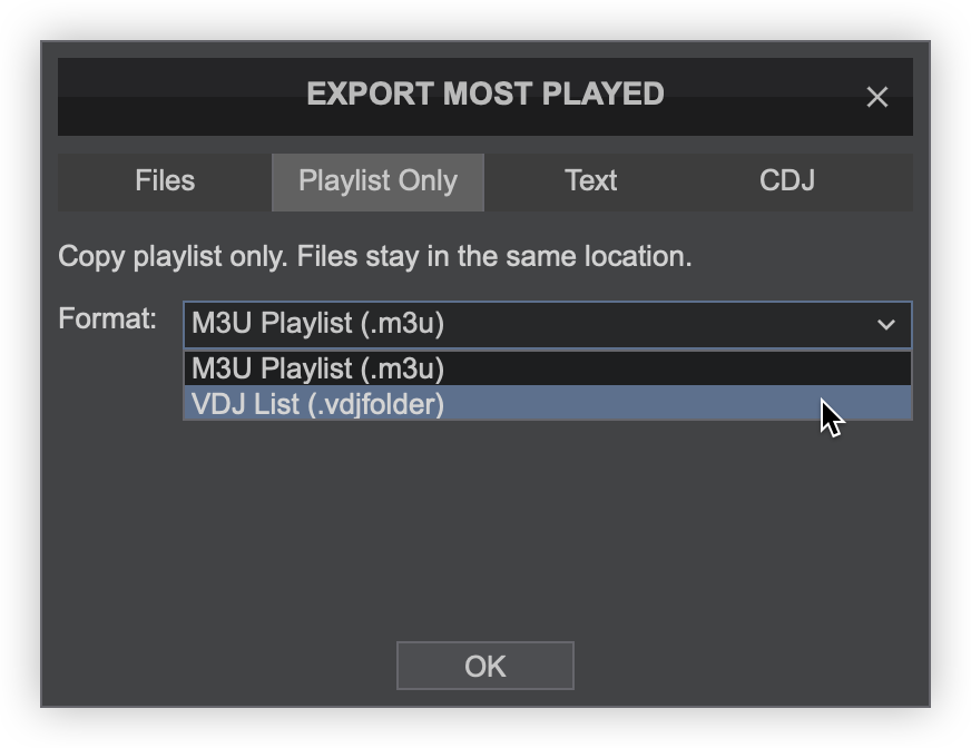 The Playlist Only tab provides the ability to copy playlists to a new destination on your computer or to an external drive without copying the actual files. The files remain in their current location. Select which format is preferred: M3U Playlist, or VDJ List.