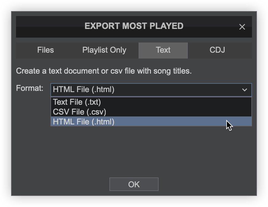 Select from the available tabs in the Export Menu to export Files, Playlist Only, Text, or CDJ.