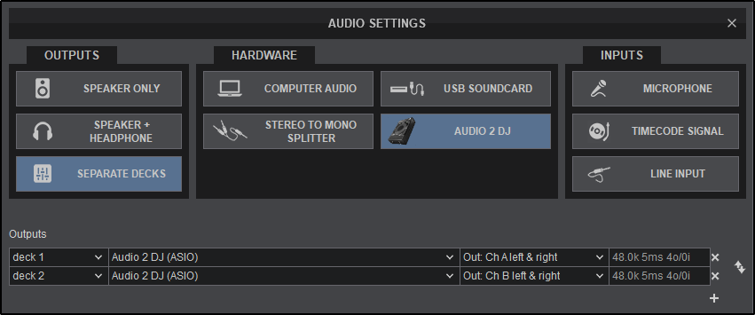 Select SEPARATE DECKS from the OUTPUT options and the multi-channel soundcard to be used from the HARDWARE options. Not all cards will be detected in the CARD options by VirtualDJ, but can still be used. If this is the case, use COMPUTER AUDIO from the HARDWARE Options. Once the audio setup is created select the multi-channel USB soundcard from the soundcard field instead.