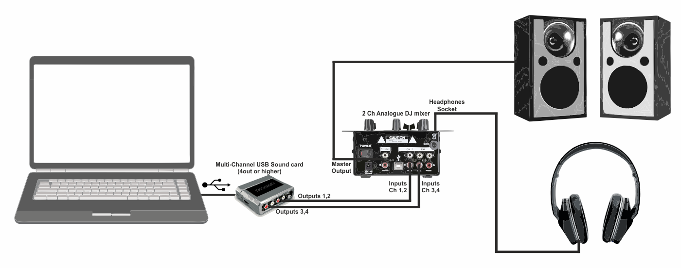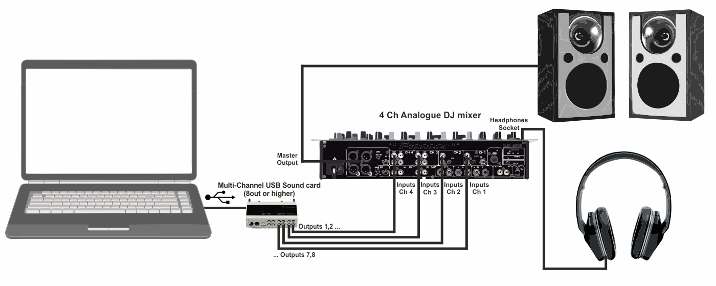 To use VirtualDJ with an external 4 Channel analog mixer, a sound card with a minimum of 4 stereo outputs or a mixer with a built in USB audio interface is required.