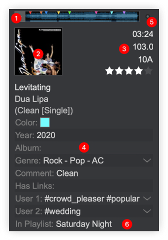 3. LENGTH, BPM, KEY & RATING. Displays the the tracks analyzed time, BPM, and Key, as well as the Key Match Checkmark (same as Browser) to show if the song is compatible with the current playing track. A rating out of 5 stars is also displayed. The rating can be set or changed directly in the panel by hovering over the stars and clicking on the chosen value.
