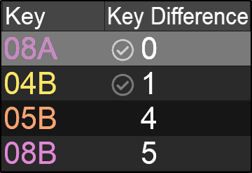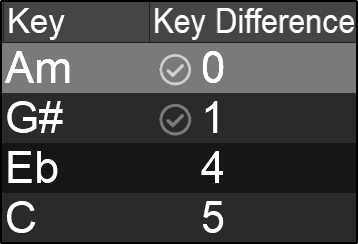 The Key Difference field displays the difference in semitones based on the active deck. If the key matches or is off by 1 semitone to the current track on the master deck, a check mark will appear beside the key value to indicate that it is safe to mix harmonically.