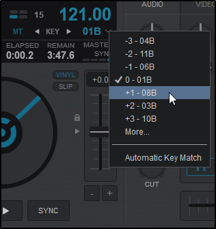 Selecting Automatic Key Match from this menu will change the key by up to one semitone on the opposing deck when a track is loaded. If the track has a greater difference than one semitone, it will remain unaffected.