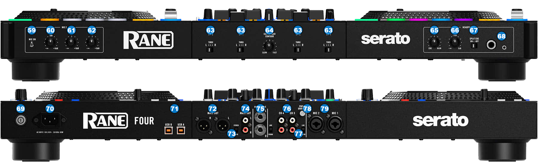 59MIC 2 ON/OFFToggles the 2nd microphone input on/off.604MIC 2 LEVELAdjust the volume of the 2nd microphone input.61MIC 2 HIAdjust the high (tremble) frequencies of the 2nd microphone input.62MIC 2 LOWAdjust the low (bass) frequencies of the 1st microphone input.63CROSS ASSIGNDefine if a mixer channel will be output regardless of the position of the crossfader (THRU position) or Left/Right.64CROSSFADER CONTOURAdjusts the contour of the crossfader.65CUE MIXBlends audio signal from the channels with PFL enabled and the Master Output in Headphones. When set to minimum position, only the Decks that have PFL enabled will be heard in Headphones. When set to maximum position, only the Master Output will be heard in headphones.66CUE LEVELAdjust the level of the Headphones Output.67SPLIT CUEWhen enabled, the signal of the PFL-enabled Decks will be routed to one side of Headphones and the signal from Master Output will be routed to the other side of Headphones.68HEADPHONESConnect your headphones using 1/4" or 1/8" adaptor.69POWER SWITCHTurns ON/OFF the power of the device. Please make sure that you have made all the necessary connections on the back of the unit before turning it's power ON.70POWER CONNECTOR Connect a standard IEC power cable.71USB PORTS (TYPE B)Usea standard USB cable to connect Rane Four with your computer. You can connect up to two computers by using the two ports of the device (labeled USB A and USB B). Make sure that you turn the SOURCE switches at the top panel to the correct USB port for software mixing.72MAIN OUT 1Master signal output connectors (XLR – Balanced). Use this to connect on your pro grade amplifier or self-powered speakers.73STEREO/MONOToggle the master output signal between stereo and monoaural.74MAIN OUT 2 Master signal output connectors (RCA – Unbalanced). Use this to connect with another mixer, or consumer grade amplifier.75BOOTH/ZONEBooth signal output (TRS – Balanced). Use this to connect your booth speakers, or an amp that needs different sound output level than master output.76CH 3/4 INPUTSConnect analog sources that can be used on channels 3 & 4 of Rane Four mixer. You can connect a turntable or a CD-Player,77ANALOG INPUT TYPESelect whether the devices connected on the analog inputs provide a line or phono level signal.78GND SCREWUse it to screw your GND (ground) cable from turntables that provide it, in order to eliminate ground static noise.79MIC INPUTSConnect your microphones. You can use both XLR or 1/4" jack connectors.