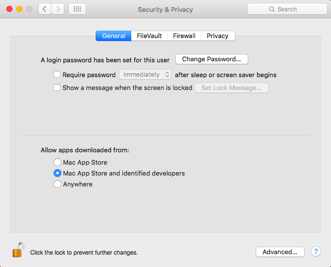 In the bottom section of the window the option for Allow apps downloaded from: will show 3 options. If Mac App Store is selected, choose either Mac App Store and identified developers or Anywhere if you are an advanced user and feel that you will not be installing anything malicious that could potentially harm your computer.