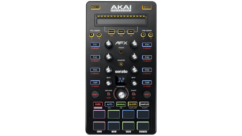 Expand your creative performance capability with AFX, a versatile 4-deck FX controller for advanced performance. A single USB connection adds over 70 intuitive controls to your DJ setup including intelligent touch-activated knobs, velocity-sensitive pads and backlit buttons. Trigger samples, assign loops and cue points, tweak effects (known as FX), manage DVS modes, automate song edits, and so much more from ultra-responsive, trusted Akai Professional hardware found in studios and stages all over the world.