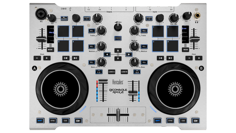 The RMX 2 features two pressure sensitive jog wheels, two rotary encoders, transport buttons, rotary potentiometers, MIDI faders, a removable crossfader that can be replaced with a Mini-Innofader, and eight velocity-sensitive backlit pads. The DJ Console offers a large control surface and spaced out controls so DJs don't feel cramped while mixing. Complete with a solid metal casing, this console is ready for intensive use. Built-in audio