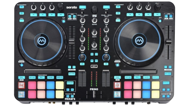 The Mixars PRIMO Controller and Mixer is a plug-and-play 2-channel controller and mixer. Each deck includes eight RGB backlit performance pads to triggering cue points, rolls, slices, and samples. What's more, the PRIMO has a KeySync button to instantly match musical keys of tracks.