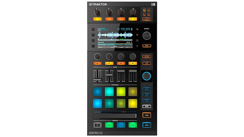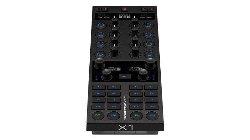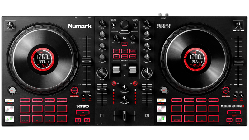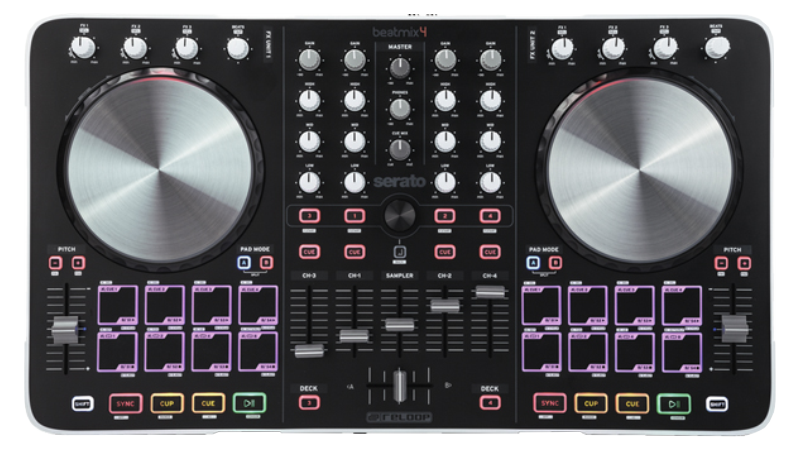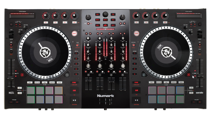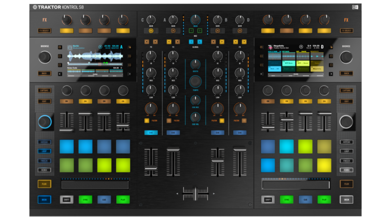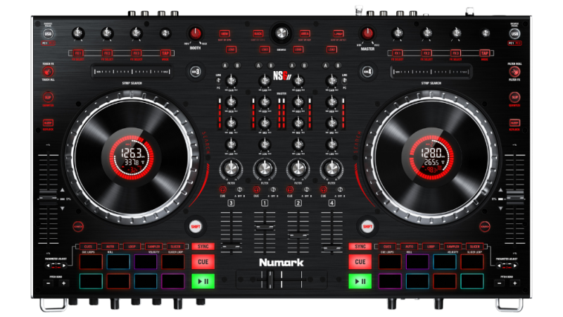 Full-integrated 4-deck controller including 30 touch-sensitive knobs and faders for intuitive control over software, 2 bright, full-color displays reveal pop-ups displays, views, and panels. Touch strip provides tactile control over track position, pitch bend and more Quickly access track BPM and Key as well as Effects and Sampler controls