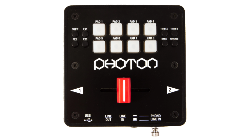 The Photon MIDI Fader is here!!! Now you can scratch the files on your computer with your portable or standard turntable! Scratch extremely accurately with no delay! Adjust the cut-in on each side of the fader, all the way down to nothingness! The Photon has two banks of 8 MIDI assignable pads and 6 assignable buttons!