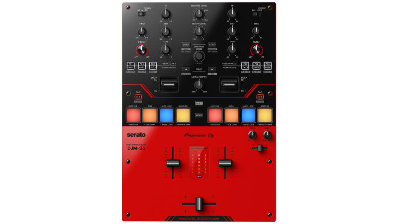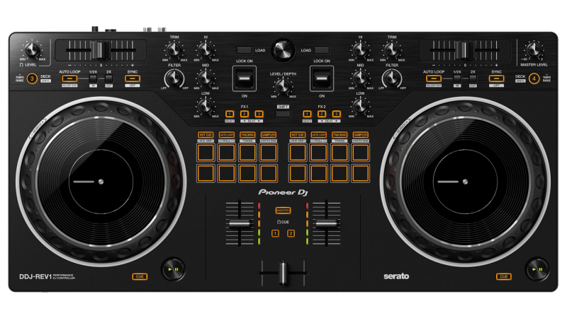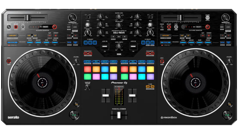 The DDJ-REV5 is a new-generation controller offering an authentic scratch experience and innovative features including its large jogs, MAGVEL FADER, dedicated buttons for Stems control, the first-ever Auto BPM Transition, and Piano Play mode.