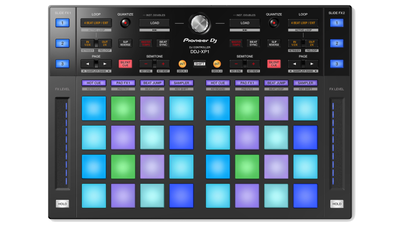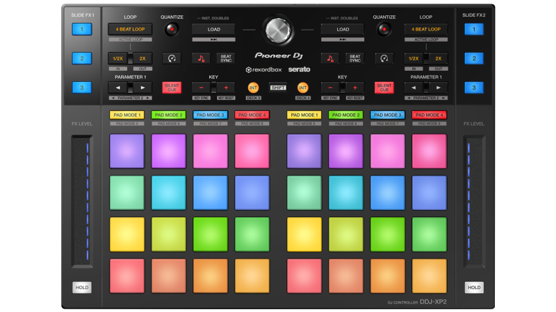 The DDJ-XP2 enhances your setup with 32 robust, multicolored Performance Pads, and puts powerful pad modes at your fingertips. Use 16 pads to control a single mode. Dynamically control your chosen combination of FX by touching the Slide FX strips and moving your finger up and down, without needing to switch the selected FX on or off.