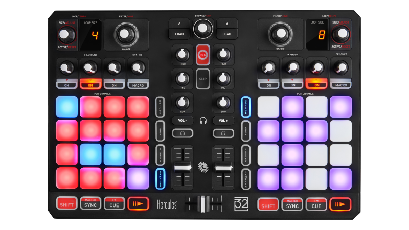The Hercules P32 DJ is an all-in-one controller that resides at the crossroads of DJing and performance. With 2 decks, screens displaying the sizes of loops, effects racks, equalizers and 32 performance pads with high-quality feel and multicolored light feedback, Hercules P32 DJ is perfectly designed for mixing.