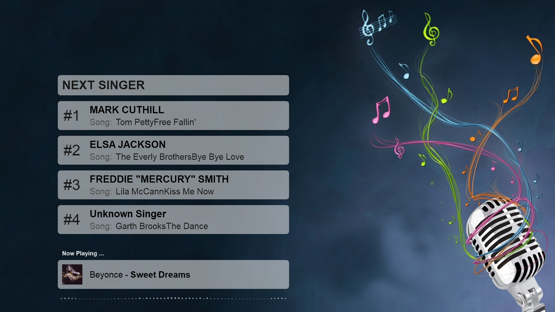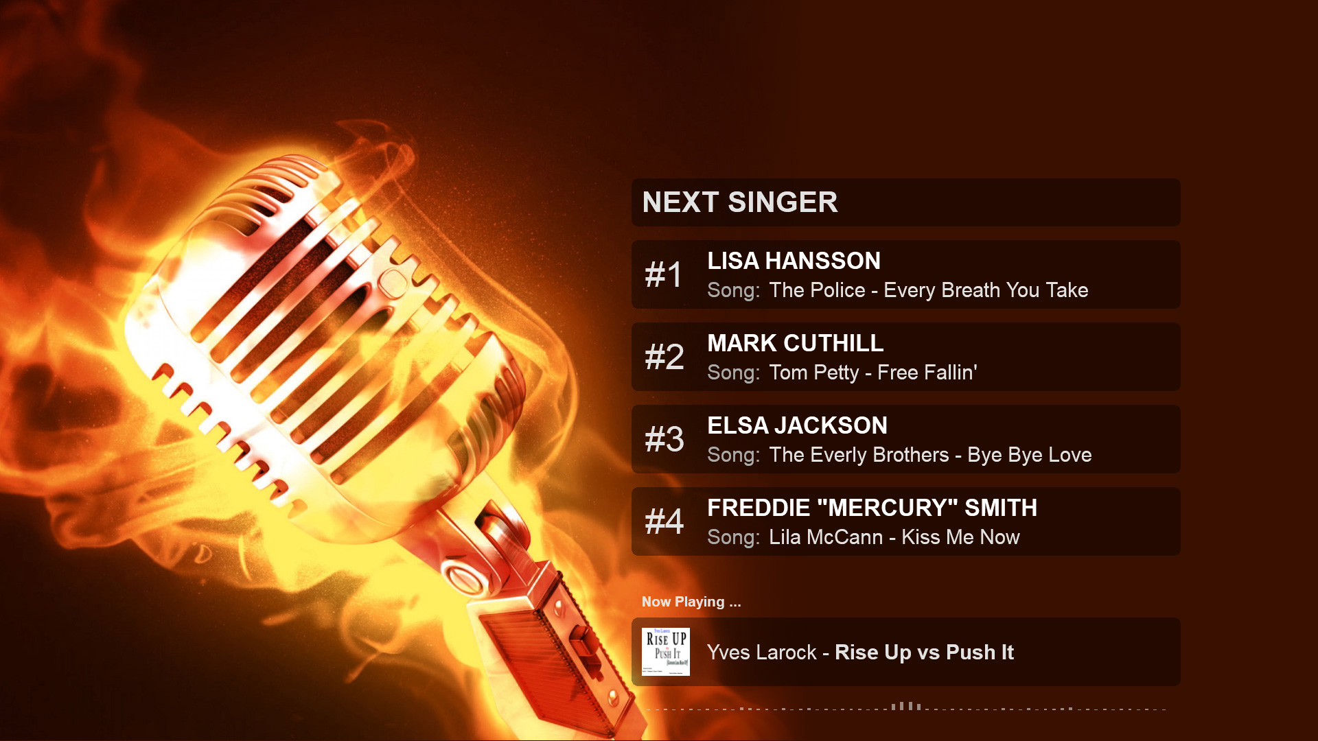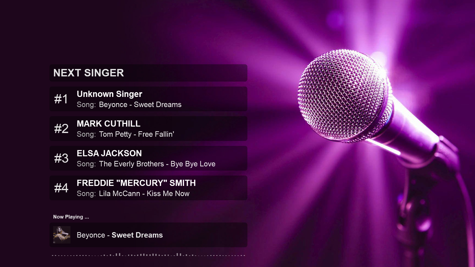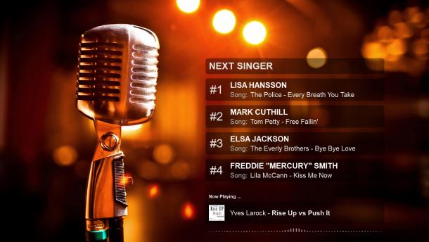 8-pack next singer list + scroller karaoke skins for VirtualDJ 2018. (Also works if playing karaoke manually outside the karaoke engine). For "Karaoke Backgrounds" images look under "Others" from menu on page here.