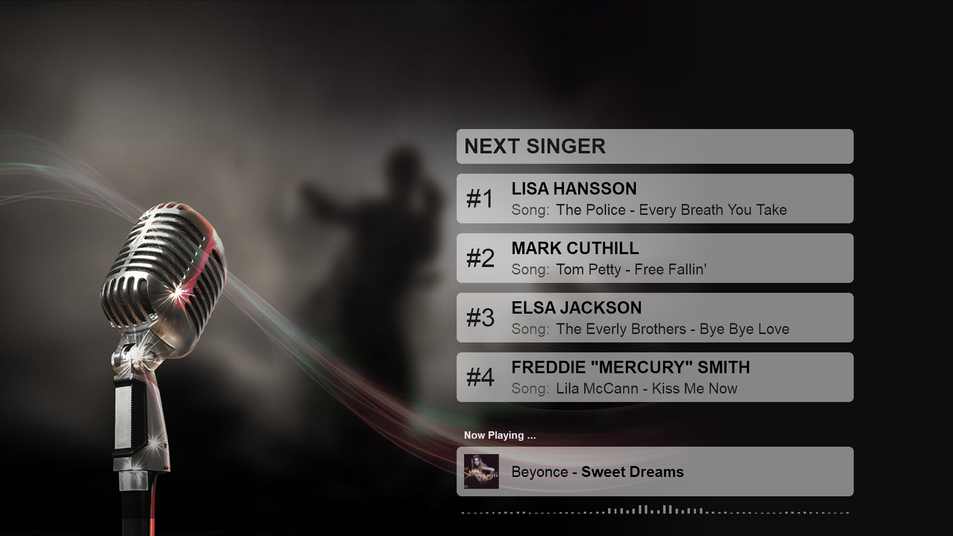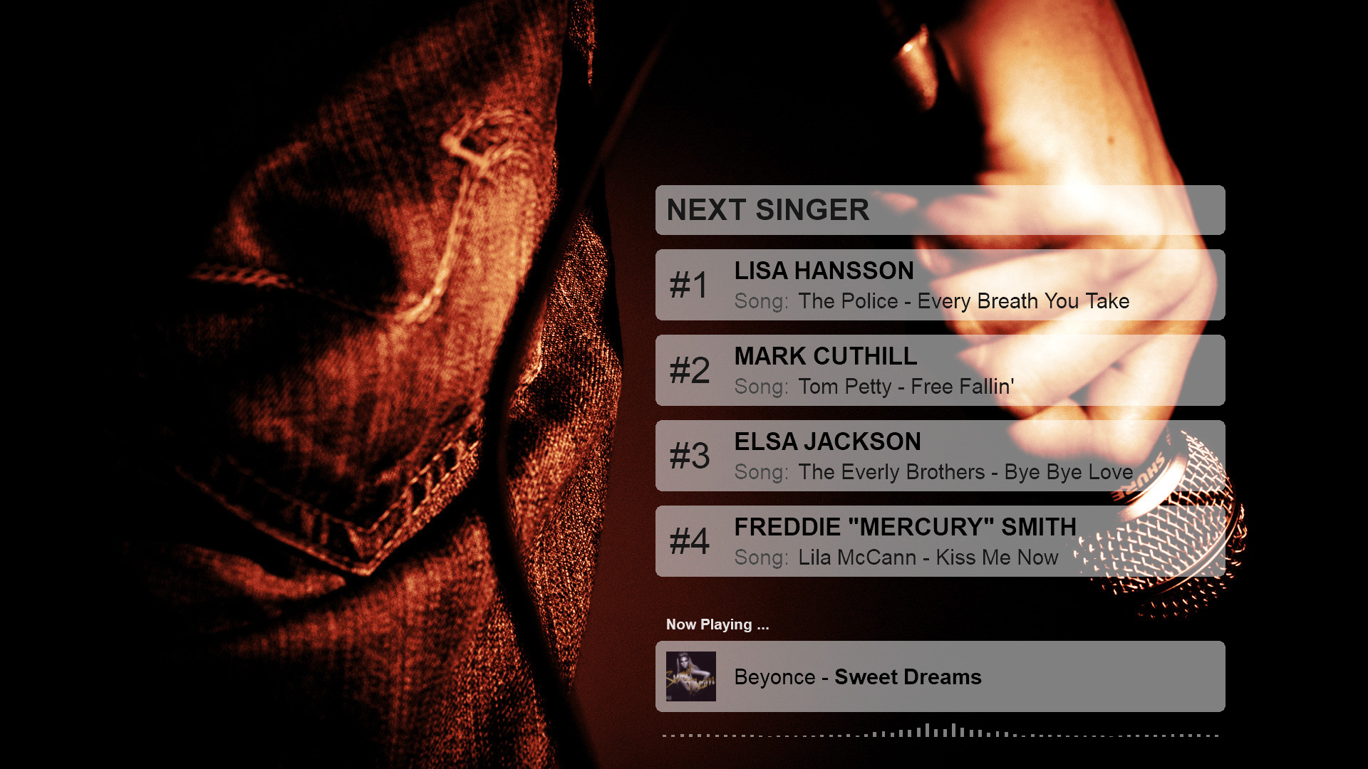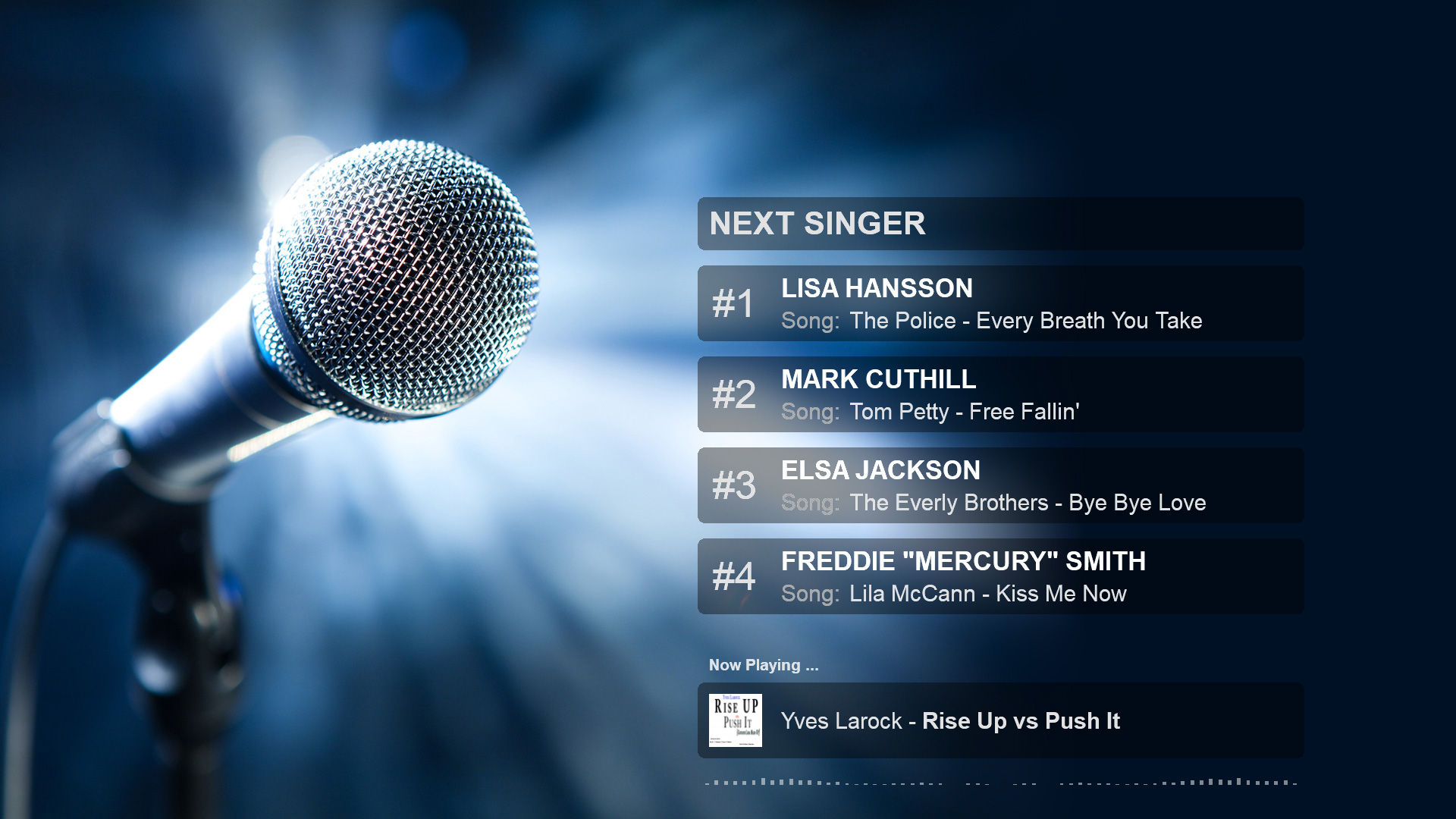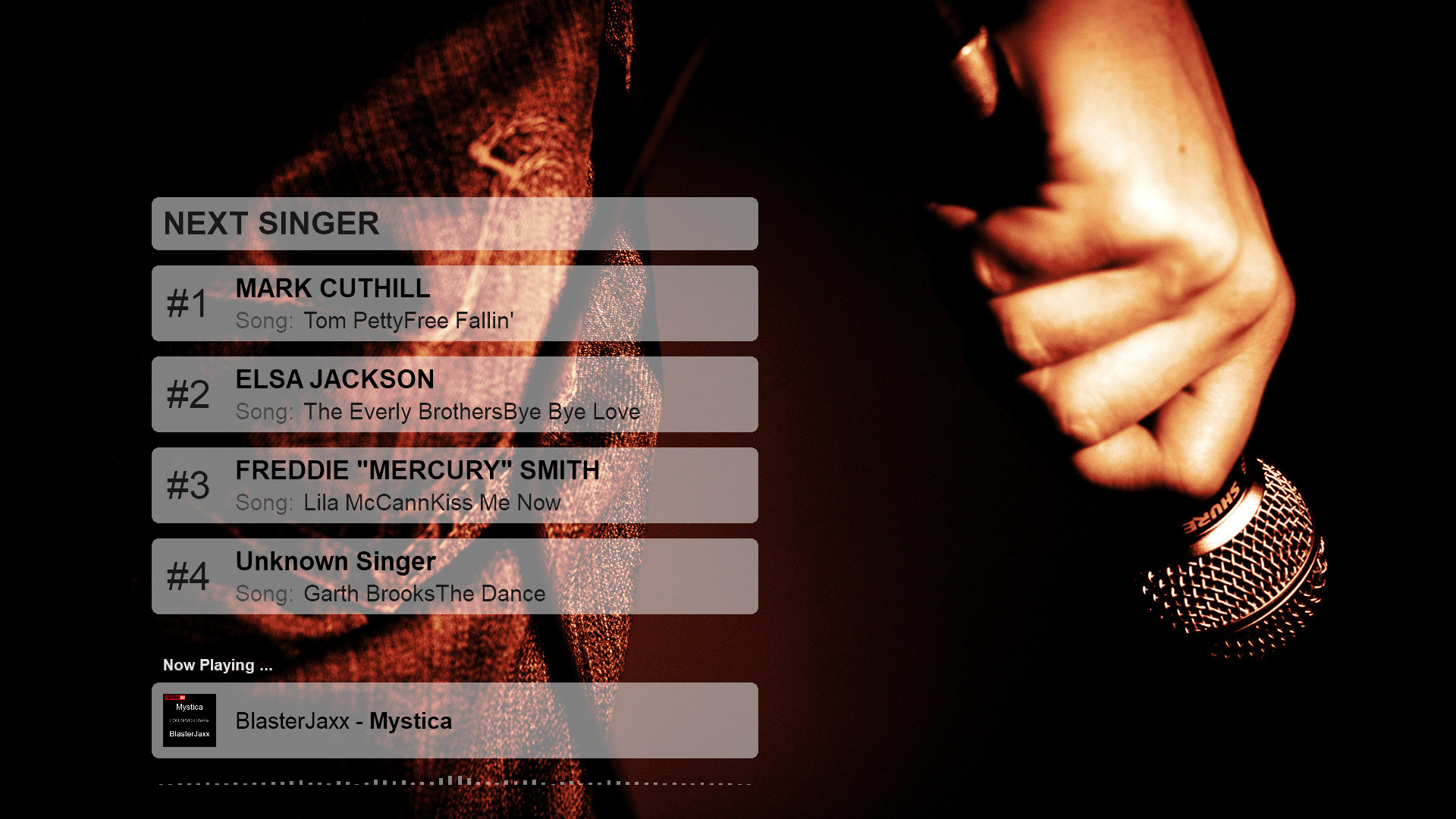 8-pack next singer list + scroller karaoke skins for VirtualDJ 2018. (Also works if playing karaoke manually outside the karaoke engine). For "Karaoke Backgrounds" images look under "Others" from menu on page here.