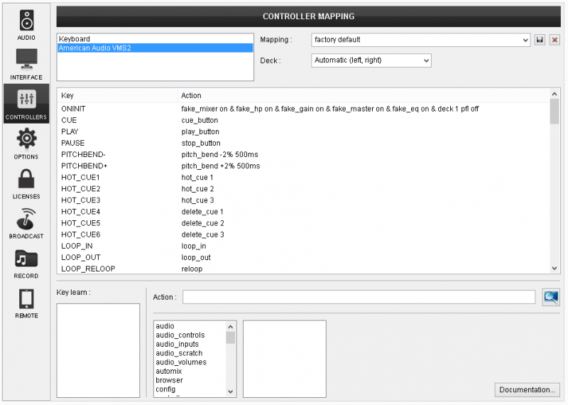 The unit should be visible in the CONTROLLERS tab of Config and the “factory default” available/selected from the Mappings drop-down list. The factory default Mapping offers the functions described in this Manual, however those can be adjusted to your needs via VDJ Script actions.