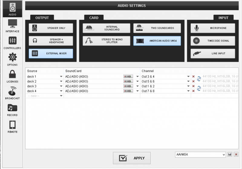 Drivers: Install the latest ASIO drivers (for Windows only) from https://www.americandj.eu/en/vms4-1.html (Download tab)