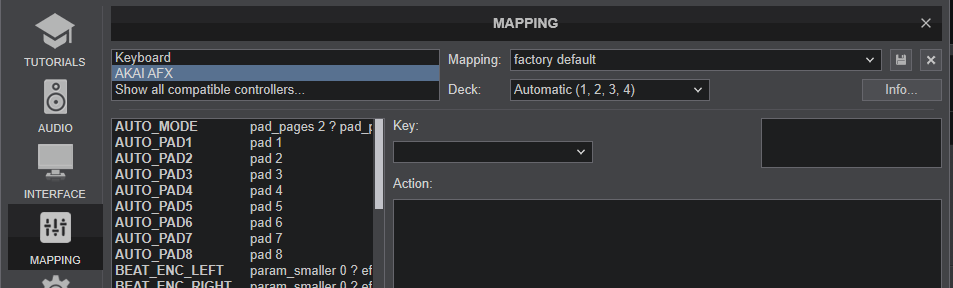 The unit should be visible in the MAPPING tab of VirtualDJ Settings and the “factory default” available/selected from the Mappings drop-down list. The factory default Mapping offers the functions described in this Manual, however those can be adjusted to your needs via VDJ Script actions.