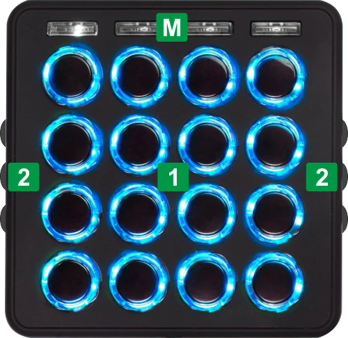 16 colored arcade style buttons, performing various operations depending on the selected Mode