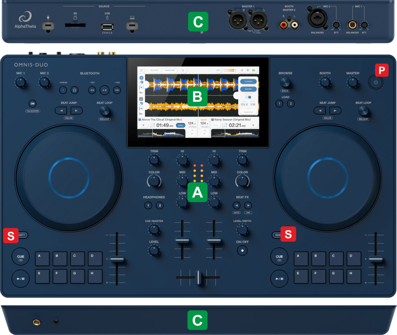 The functionality of each button, knob and connection per section (as shown in the image above) will be explained in detail in the next chapters
