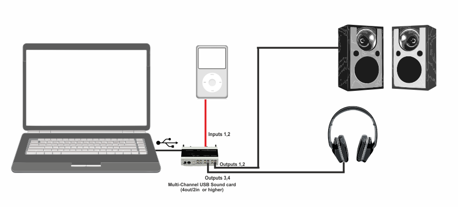 An analog source may be routed to the Master Output, using any input of a multi-channel sound card.